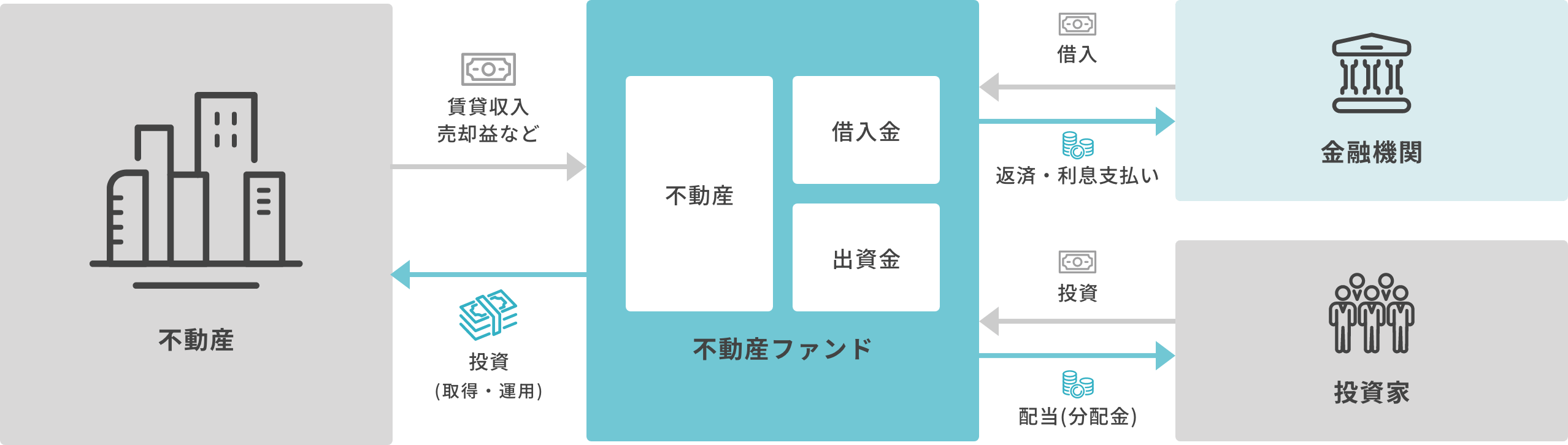 一般的には、投資対象資産を不動産保有企業から特別目的会社(SPC)という事業体へ譲渡し、万が一不動産保有企業が倒産した場合でも、SPCには影響を受けないようにする仕組みにより運用します。